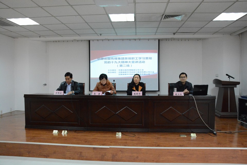 12月27日下午,按照《河南省總工會(huì)關(guān)于開展河南省職工 學(xué)習(xí)貫徹黨的十九大精神 千名勞模大工匠·萬(wàn)場(chǎng)大宣講活動(dòng)的通知》要求,由中原出版?zhèn)髅郊瘓F(tuán)主辦、河南省新華書店發(fā)行集團(tuán)承辦的出版集團(tuán)系統(tǒng)職工第二場(chǎng)學(xué)習(xí)貫徹黨的十九大精神宣講會(huì)在發(fā)行集團(tuán)四樓會(huì)議室舉行,中原出版?zhèn)髅郊瘓F(tuán)黨委委員、副總裁、集團(tuán)直屬單位黨委書記馬雪總裁,集團(tuán)工會(huì)副主席、集團(tuán)直屬單位黨委副書記張彩華主席出席會(huì)議,發(fā)行集團(tuán)班子成員、中層人員、部分黨員和職工代表,及來(lái)自河南省新華書店文化發(fā)展公司、銷售與市場(chǎng)雜志社、《中學(xué)生學(xué)習(xí)報(bào)》社、出版對(duì)外貿(mào)易公司共6家單位150余名干部職工參加了此次宣講學(xué)習(xí)活動(dòng)。