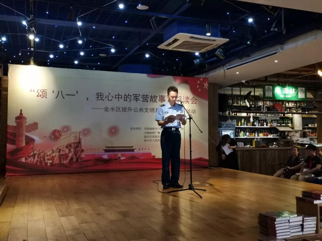 8月1日上午,為慶祝中國人民解放軍成立92周年,更好展現(xiàn)當(dāng)代人民子弟兵卓越風(fēng)采,講述軍民相擁的動人故事,推進(jìn)提升公共文明素養(yǎng)“七進(jìn)”工作,河南省新華書店發(fā)行集團(tuán)有限公司、河南教育廣播、金水區(qū)委宣傳部(文明辦)、金水區(qū)人民武裝部共同舉辦“頌‘八一’,我心中的軍營故事”朗讀會,暨金水區(qū)提升公共文明素養(yǎng)“七進(jìn)”系列活動在中原圖書大廈回聲館舞臺舉行。