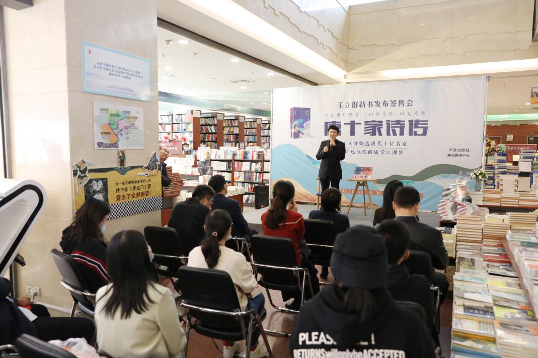 為了能與王立群先生面對(duì)面交流,上千名讀者一早來(lái)到鄭州購(gòu)書(shū)中心排隊(duì)等候,還有不少讀者從外地專程趕來(lái),有來(lái)自滎陽(yáng)的詩(shī)詞愛(ài)好者,也有來(lái)自重慶的“鐵桿”書(shū)粉。王立群與讀者們真誠(chéng)地分享了該書(shū)選取的主要人物,從盛唐到晚唐,以詩(shī)為經(jīng),以史為緯,深刻的解讀了一代詩(shī)人的廟堂江湖夢(mèng)。在新書(shū)發(fā)布會(huì)上,王立群說(shuō),以往的唐代詩(shī)歌作品解讀類書(shū)籍,一般是通過(guò)介紹單篇作品進(jìn)行人物或作品解讀,就像一顆顆珍珠沒(méi)有串成線。在新書(shū)《唐十家詩(shī)傳》中,他在唐代眾多詩(shī)人中選了十位詩(shī)人,將這些詩(shī)人的人生,用文學(xué)散文筆法介紹其人生重要節(jié)點(diǎn)的代表作,并一一解讀,好比把一顆顆珍珠似的作品以詩(shī)人生平為線串連起來(lái),側(cè)重講述創(chuàng)作的時(shí)間、地點(diǎn)、創(chuàng)作的緣由;顒(dòng)現(xiàn)場(chǎng),王立群還與讀者朋友進(jìn)行了親切的互動(dòng),對(duì)讀者提出的問(wèn)題,他以一個(gè)長(zhǎng)輩的身份,從專業(yè)的角度進(jìn)行了解答,現(xiàn)場(chǎng)掌聲不斷。