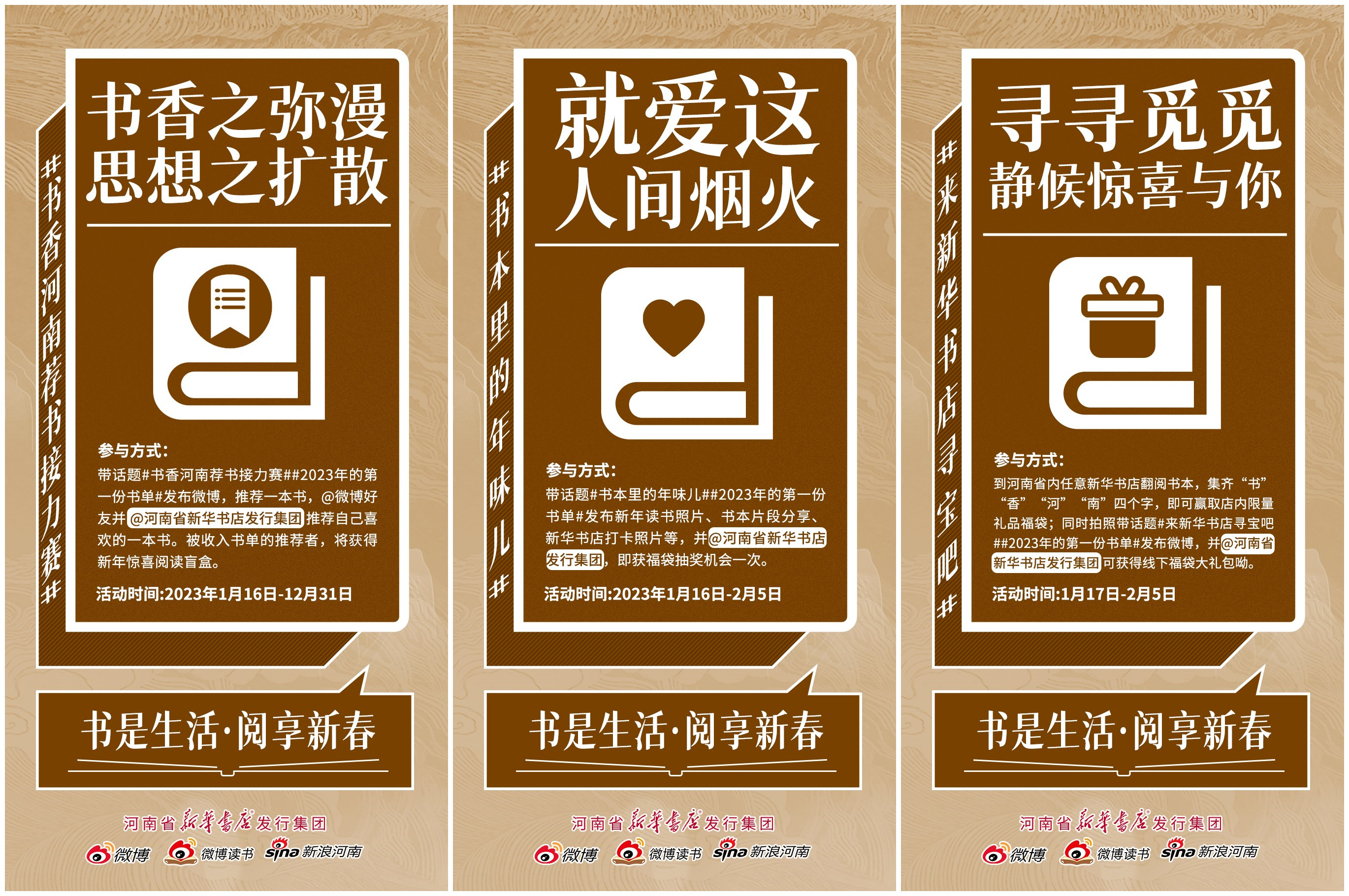 河南省新華書店圍繞2023年“癸卯吉年·書香賀歲”春節(jié)主題,還精心策劃了線上“書香年味兒”、“書香接力賽”薦書、老家河南年味濃等系列活動。百姓文化云平臺將開展專題對#舌尖上的河南年味兒、#新年就要這樣“游”、#春節(jié)非遺不打烊、#新春節(jié)目連連看進行內(nèi)容展播。