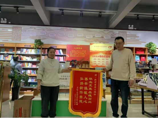 10月18日,市民讀者薛女士來到修武縣店賣場,將一面繡有“敬業(yè)正直品德高尚 善舉溫暖人心 弘揚新華美德”的錦旗贈予縣店員工王林征,并再三對其表達感激之情。