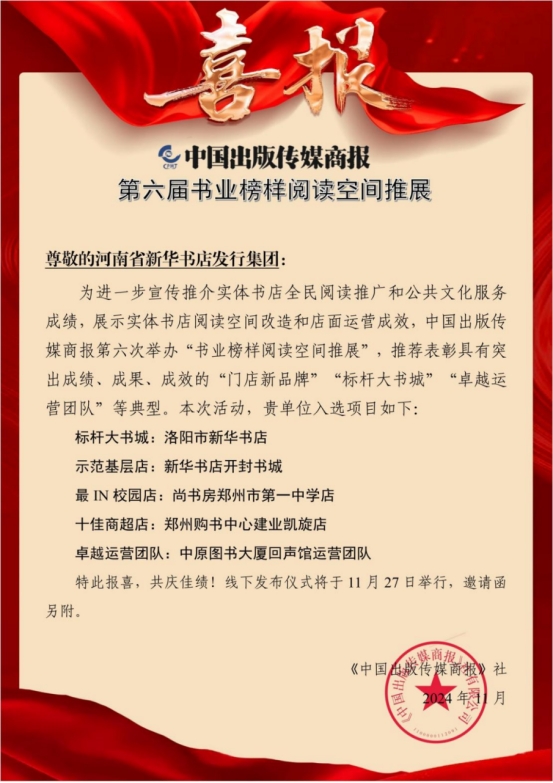 11月27日,由中國新華書店協(xié)會與中國出版?zhèn)髅缴虉舐?lián)合舉辦的“第六屆書業(yè)榜樣閱讀空間推展”發(fā)布活動于山西太原圓滿落幕。本次活動揭曉了包括“卓越運營團(tuán)隊”“十大門店新品牌”“標(biāo)桿大書城”“示范基層店”“格調(diào)社區(qū)店”“十佳商超店”以及“最I(lǐng)N校園店”在內(nèi)的七項推選結(jié)果,全面展示了書業(yè)領(lǐng)域的最新發(fā)展成就,并吸引了業(yè)界的廣泛關(guān)注。在此次推展活動中,河南省新華書店發(fā)行集團(tuán)表現(xiàn)優(yōu)異,一舉斬獲五個獎項。