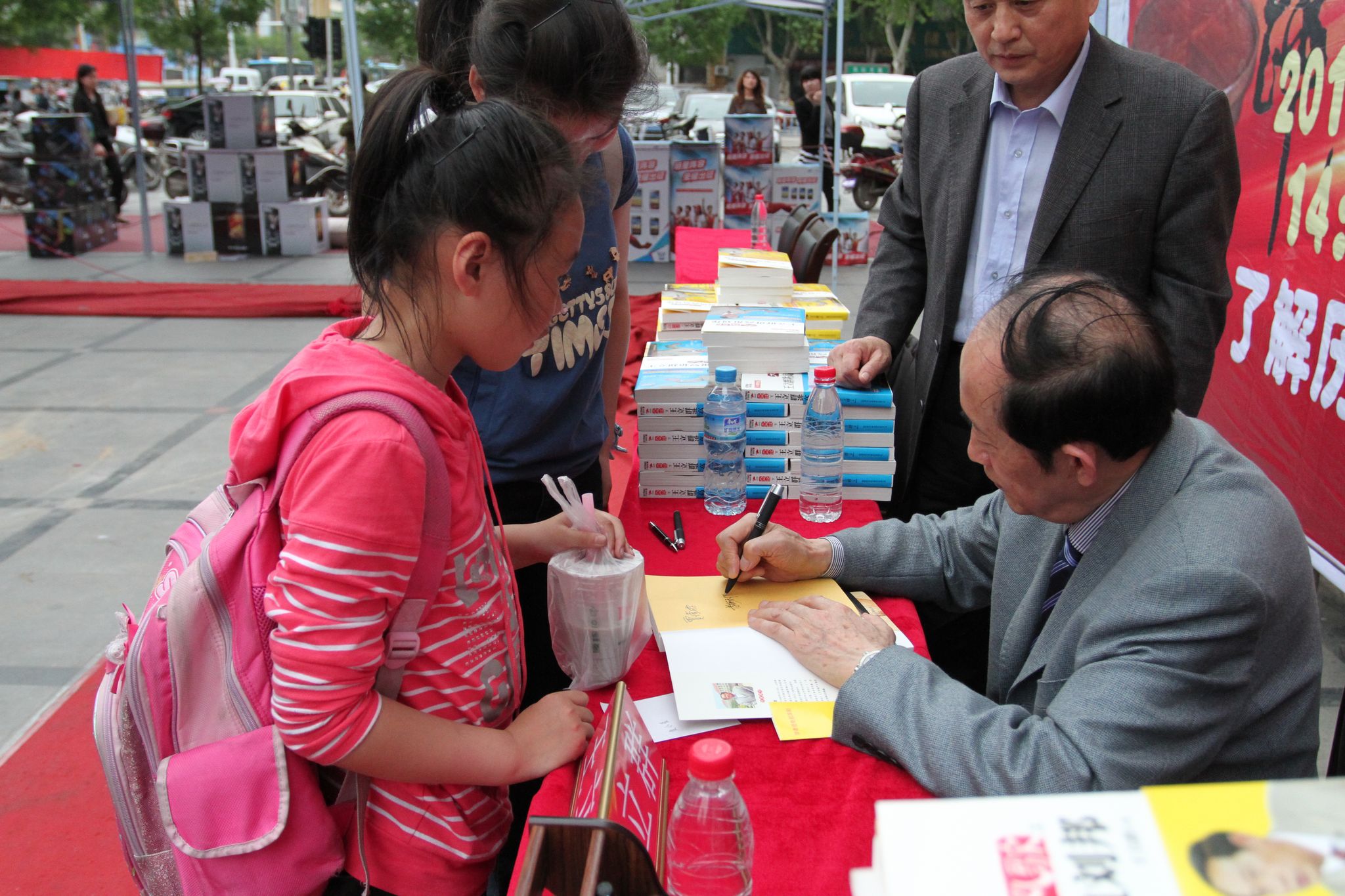 簽售過(guò)程中,王立群教授一直耐心與讀者交流,并詳細(xì)詢問(wèn)讀者的姓名,仔細(xì)的簽在書的扉頁(yè),助手遞到他手上的水都沒(méi)顧上喝一口。炎熱的天氣,擋不住讀者的熱情,有些讀者手中少則兩三套書,多則十幾套,他們表示購(gòu)書簽名是為了送給親戚朋友!八蛶Ш灻臅毁F,有保存價(jià)值、有品位。”一位讀者對(duì)記者說(shuō)。有一位老者是王立群教授的忠實(shí)粉絲,他的所有作品全部都有,并且都拿到了現(xiàn)場(chǎng)簽名,老者激動(dòng)地說(shuō):“有幸拿到王立群教授簽過(guò)名字的書,太高興了”。原計(jì)劃兩個(gè)小時(shí)的簽售活動(dòng),因?yàn)樽x者太多,又延長(zhǎng)了半個(gè)小時(shí)的時(shí)間,整個(gè)簽售過(guò)程共為讀者簽售三百多套圖書。