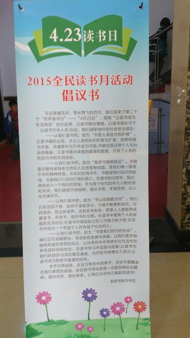 為更好營(yíng)造書香社會(huì),促進(jìn)社會(huì)閱讀風(fēng)尚的形成,提升民族文化素質(zhì),推進(jìn)學(xué)習(xí)型城市建設(shè),提高我店綜合收益,在4月23日世界讀書日來臨之際,新密市新華書店發(fā)出了2015年全民讀書月活動(dòng)倡議書,提出了“美麗四月天,相約讀書日”閱讀主題,全力搞好宣傳,確;顒(dòng)取得實(shí)效,該店利用電子顯示屏、張貼海報(bào)、賣場(chǎng)布置等手段進(jìn)行宣傳,營(yíng)造氛圍,并積極組織開展流動(dòng)售書活。