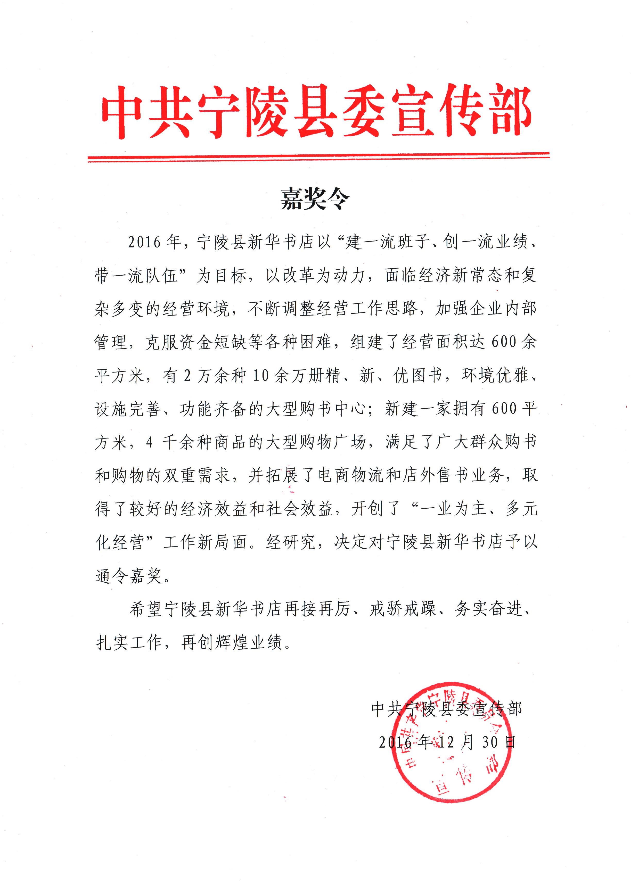 日前,寧陵縣委宣傳部下發(fā)《嘉獎(jiǎng)令》,對(duì)寧陵縣新華書店不斷調(diào)整經(jīng)營(yíng)工作思路、開(kāi)創(chuàng)工作新局面通令嘉獎(jiǎng)。