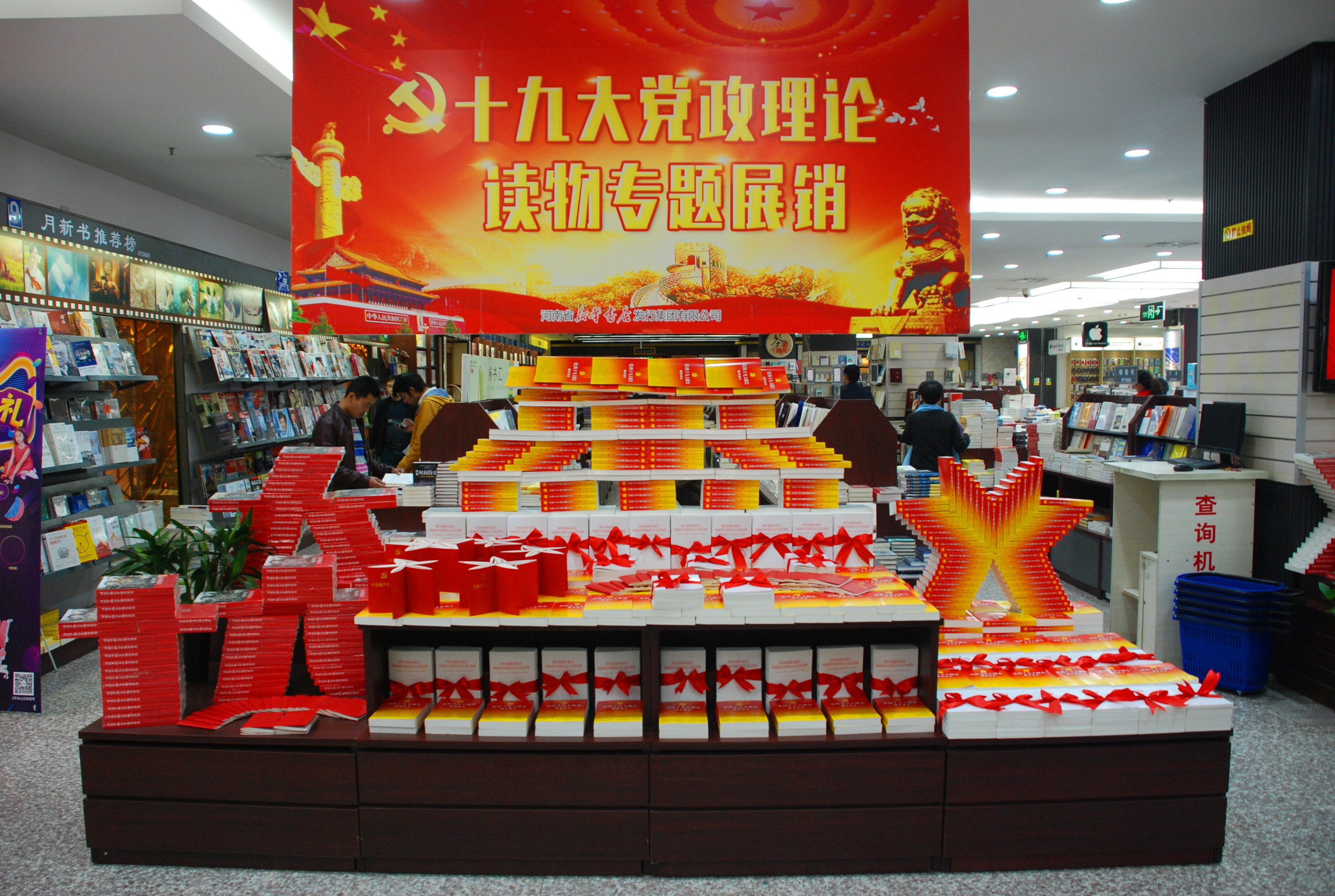 首發(fā)式結(jié)束后,趙素萍部長(zhǎng)等領(lǐng)導(dǎo)來(lái)到中原圖書大廈一樓“十九大黨政理論讀物專題展臺(tái)”前,認(rèn)真翻閱十九大文件及學(xué)習(xí)輔導(dǎo)讀物,對(duì)下一步十九大文件及學(xué)習(xí)輔導(dǎo)讀物的推廣工作做出了重要指示。